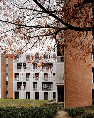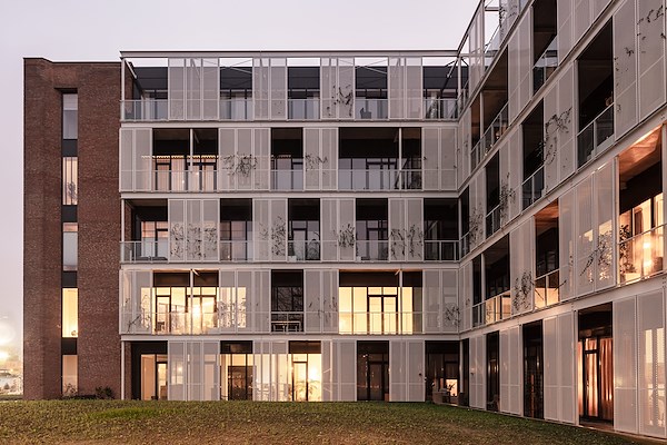 De gevel in de snede kenmerkte zich door zijn gelaagdheid, detaillering en de high-tech uitstraling die contrasteerde met het ambachtelijke metselwerk. Dat contrast wilden we handhaven: er is een nieuwe open gevel ontworpen in hetzelfde ritme als de bestaande. De constructie die de bestaande lamellen ondersteunt hebben we gebruikt om een tweede laag toe te voegen in de vorm van geperforeerde stalen schermen. Deze kunnen de bewoners laten begroeien en zo ontstaat er een prettige groene binnenwereld die contrasteert met de zware metselwerkgevel.