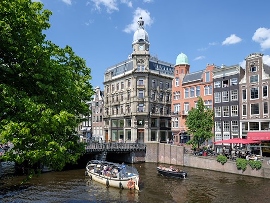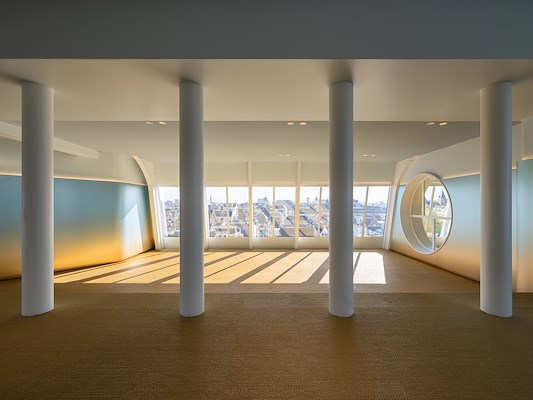 De verticale kleurverandering bereikt zijn hoogtepunt op de bovenste twee verdiepingen. De muren van de zesde verdieping veranderen geleidelijk van goud naar de hemelsblauwe vloer, afwerkingen en plafond in het Rietveld-paviljoen. De essentie van dit stuk modernistische geschiedenis blijft bewaard. Verfijnde afwerkingen zoals het tapijt en de gordijnen helpen om het paviljoen tot een perfecte ruimte te maken voor evenementen, zoals gala's en modeshows - net zoals bijna 100 jaar geleden. De glazen wanden van het ontwerp van Rietveld bieden bezoekers een panoramisch uitzicht over de daken van Amsterdam.