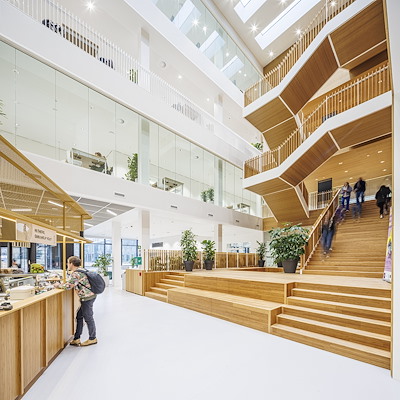 Akoestiek is in de open omgevingen belangrijk en de vraag was hoe je dat het beste kunt oplossen. Het is een ruimte waar altijd rumoer is, maar waar studenten ook moeten kunnen werken. De flexibele gebouwen zijn adaptief. Op akoestisch gebied moet dat natuurlijk aansluiten. Er is een gewenst niveau nagalmtijd aangegeven dat het team van adviseurs, waaronder de architect, het bouwfysisch bureau Peutz en de specialisten van Ecophon hebben kunnen waarmaken binnen dit architectonische hoogstandje. In dit soort ruimten is het een uitdaging de akoestiek goed te krijgen. Door de hoogte, de enorme glazen wanden die veel geluidreflectie geven en de harde vloer, heb je voor een goede akoestiek zowel plafond als wandabsorptienodig. Naast het akoestische plafond van Ecophon zijn er houten akoestische wandpanelen met daarachter minerale wol toegepast zodat een akoestisch aangename ruimte ontstaat. Er zijn verschillende akoestische plafondpanelen in het project toegepast,zoals de Focus A en Gedina A, maar dan in een 15 mm grid systeem wat een smal profiel is, zodat je de lijnen minder ziet. Hier en daar is er gekozen voor verrassende kleurvlakken in de gebouwen, waardoor visueel een andere wereld ontstaat. Ecophon heeft een mooi pallet aan kleuren voor de panelen, die daardoor de kleur van het nieuwe interieurlandschap hebben bepaald. Kortom, Fontys heeft een prachtig getransformeerde campus waar de natuurlijke en vooral groene verbinding tussen docent, student en de bezoekers uit de stad centraal staat. Dit binnen een aangename akoestische omgeving.
