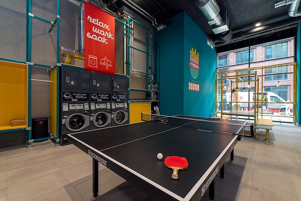 Bijzonder is de combinatie van high-end kantoren met sociale woningbouw, met op de begane grond koopwoningen voor starters, een restaurant en twee bedrijfsruimtes. Het multi-tenant kantoorgebouw op de kop van Crossover beschikt over een gedeelde lobby, die is verbonden met het restaurant. Elke kantoorverdieping heeft toegang tot een eigen dakterras, wat bijdraagt aan een gezonde werkomgeving. Het woongedeelte is ontworpen als ‘Startblok’; een sociaal woonconcept waar jonge Amsterdammers en statushouders een community vormen. Bewoners hebben toegang tot drie dakterrassen en zes thematische ontmoetingsruimtes, waaronder een filmruimte, een studeerkamer en een gym. Omdat de zuidgevel geluid- en luchtdicht moest zijn, hebben de woningen een voordeur met ventilatierooster aan de noordkant. De voordeuren liggen aan open galerijen rond geluidluwe, groene binnenhoven, wat luxe is voor dit type woningen.