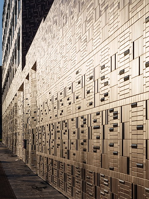 De gevels van het gebouw trekken van veraf de aandacht. Ze zijn bekleed met een levendig mozaïek van keramische tegels, waarin de voorgeschreven opbouw van plint, middendeel en top herkenbaar is. Daarmee voegt het gebouw zich op een eigentijdse manier naar het klassieke beeldkwaliteitsplan van supervisor Jo Coenen. De gevel is extra expressief door een gelaagde, driedimensionale inpassing van erkers die in het gevelvlak zijn teruggelegd.