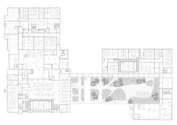 Er zijn vier open plekken gemaakt in en tussen de gebouwen: drie vides en een nieuw schoolplein. Deze ruimten brengen licht en lucht terug in de gebouwen, dienen als oriëntatiepunten, verspreiden sfeer en daglicht en verbinden de gebouwen, vakken en studenten. Ook maken ze de grote kelders bruikbaar voor onderwijs. De extra ruimte voor het groeiend studentenaantal is binnen de gebouwen gevonden. Terwijl het totale bouwoppervlakte afnam, kwam er meer dan duizend vierkante meter lesruimte bij.