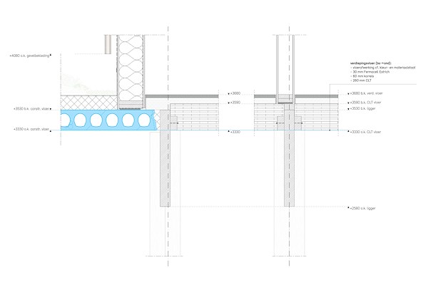 Details houten opbouw en nieuwe clt vloer in combinatie met bestaande vloer