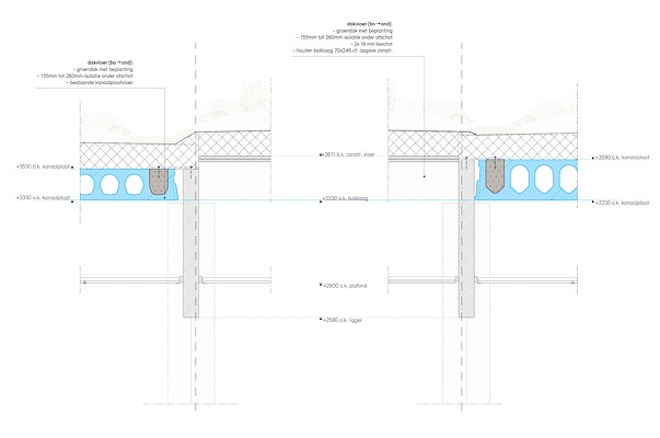 Details nieuwe houtconstructie in combinatie met bestaande vloer
