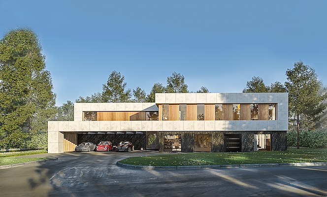 Het resultaat is een minimalistische villa met een luxe uitstraling waarin de horizontaliteit een van de kenmerkende eigenschappen is. Op de begane grond en eerste verdieping zijn de brede banden van natuursteen bepalend voor het karakter van het gebouw. De banden geven het gebouw een heldere eenheid. De banden vormen de verbinding tussen de twee volumes van de oorspronkelijke woning en het bedrijfsgebouw. Deze zijn ten opzichte van elkaar verschoven.