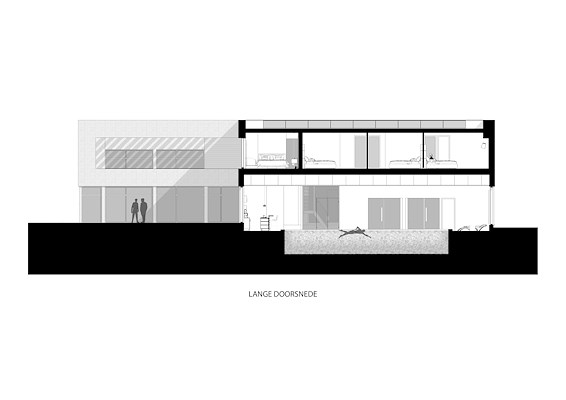 De banden komen terug in de zij - en de ten opzichte van elkaar verschoven achtergevel. Daar markeren ze de vijf balkons voor de slaapkamers op de eerste verdieping. De grote openingen op de begane grond openen vanuit de zwembad (100m2) met sauna en beachbar naar het terras op het zuiden. Aan de voorgevel bieden de terugvallende gevels van glas en met hout bekleden penanten variatie in het beeld.
