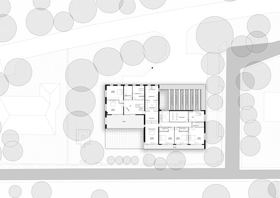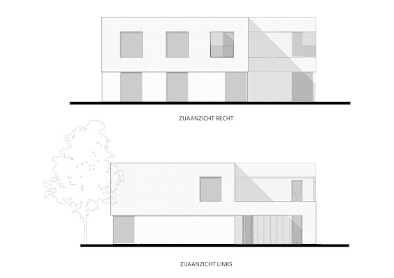 De band over de eerste verdieping strekt zich uit over het hele gebouw en vormt bij het terugvallende volume een carport met zij-ingang. De hoofdingang wordt gemarkeerd door de ruim terugvallende smart pivoterende deur uitgevoerd in Meranti. Op de eerste de bovenverdieping volgt de band het teruggetrokken volume zodat variatie in het beeld ontstaat.