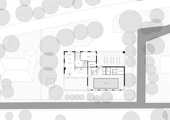 Er is optimaal gebruik gemaakt van de bestaande bomenstructuur en waterpartijen om een diversiteit aan plekken te creëren. Hoogteverschillen geven de tuin een dynamisch karakter en verschillende recreatiemogelijkheden. De lijnen van de bouwelementen zoals vlonders en muurtjes en hekwerk in de tuin weerspiegelen de horizontaliteit van het bouwvolume.