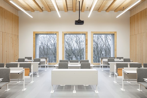 Dankzij nauwe samenwerking tussen architect, constructeur en installatieadviseur is het Marga Klompé Building tot stand gekomen waarin innovatieve oplossingen hebben geleid tot een optimaal resultaat. De collegezalen boven de grote zalen hebben indrukwekkende overspanningen van 9.2 meter, gerealiseerd met CLT-ribbenvloeren. Hierdoor konden we voldoen aan de eisen voor doorbuiging, trillingen en akoestiek. Door de ribben hoger te maken en verder uit elkaar te plaatsen, kreeg de vloer meer massa voor een betere akoestiek, terwijl de ruimte tussen de balken benut kon worden voor ventilatiekanalen, verlichting en andere technische voorzieningen. Het akoestische houten lattenplafond tussen de balken verbergt de techniek subtiel, terwijl de balken zelf fraai in het zicht blijven, waardoor de houten constructie integraal deel uitmaakt van de architectuur.