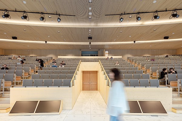 Het ontwerp van het Marga Klompé Building sluit naadloos aan bij de modernistische architectuur van de Tilburgse universiteitscampus. De circulaire ambities zijn weerspiegeld in het hernieuwbare karakter van de houten constructie, wanden, vloeren, trappen, kozijnen en afwerkingen. Het team heeft een uniek droogbouwsysteem toegepast. Deze houten ribbenvloeren – CTL-vloeren die versterkt zijn met balken – maken het mogelijk grote vrije overspanningen te maken die voldoen aan de hoge akoestische eisen die nodig zijn voor het programma. De Portugese natuurstenen gevel, voorzien van diepe negges, is een directe verwijzing naar het iconische Cobbenhagengebouw uit 1962 van Jos Bedaux. De natuursteen heeft een zeer lange levensduur, is losmaakbaar en bevestigt de circulaire ambities. Het stenige volume harmonieert met de architectuur rondom en vormt een intrigerend contrast met de weelderige bosrijke omgeving. Het alzijdige gebouw is geïntegreerd in de campus en markeert de entree vanaf het station.