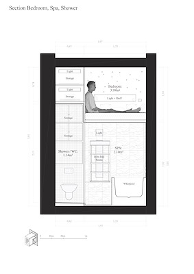De Cabanon is de ombouw van een bestaande opslagruimte naar een woonruimte. Het appartement bevindt zich op de bovenste verdieping van een woongebouw uit de jaren 50 in het centrum van Rotterdam. De vier ruimtes in de Cabanon zijn vormgegeven op basis van standaardproducten: de slaapkamer is ontworpen met een specifiek matras in gedachten; de spa volgens de lengte van het bad; de keuken is gebaseerd op de diepte van de minikoelkast - dat alles om de noodzaak van op maat gemaakte objecten te vermijden, en juist andersom te denken:
