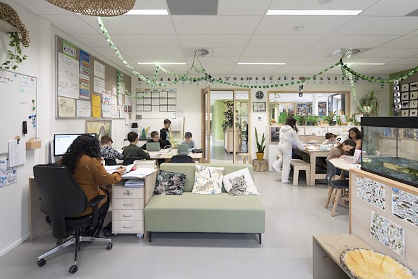 Deze vloer past perfect bij de visie van de school en combineert prachtig met houten elementen, houten meubels en zachte groentinten.