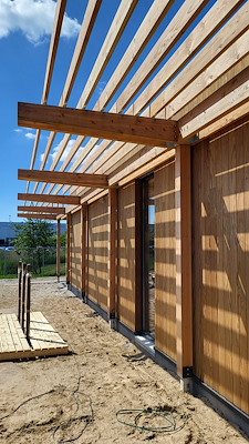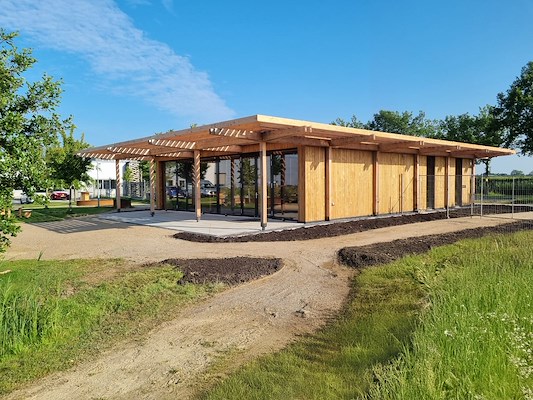 Het paviljoen bestaat uit een houten structuur en gevel. De structuur, gemaakt van lariks kolommen en balken, is aan de buitenkant van het gebouw geplaatst, waardoor het paviljoen niet alleen verbonden is met het hoofdgebouw, maar ook een naadloze overgang vormt tussen binnen en buiten. De houten structuur, samen met de geprefabriceerde houtskeletgevel, minimaliseert de ecologische impact van het gebouw.