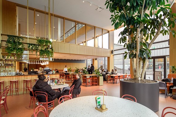Het Grand café, op de hoek van het gebouw en van buitenaf toegankelijk is dubbel hoog en ingericht met een aantal grote objecten. De bar is een ware eyecatcher. Warm kleurgebruik, spiegelstroken, diversiteit in verlichting en een messing frame met glazen en planten boven de bar, geven de ruimte een aangename horecasfeer.
