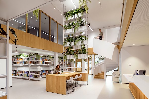 Het Grand Café, de mediatheek en de werkgroepzalen zijn het visitekaartje van de faculteit. We hebben ze vormgegeven als dé showcases van het interieur, onderscheidend en expressief.