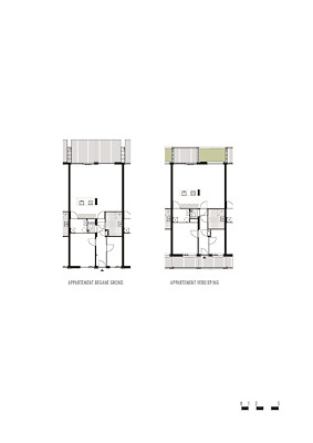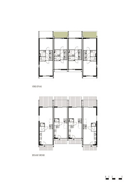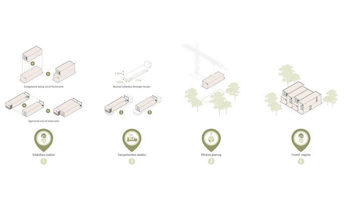 De woningen zijn opgebouwd uit geprefabriceerde modules. Elke woning bestaat uit twee modules. Door ze op een verschillende manier te combineren ontstaan de diverse woningtypologieën. De appartementen bestaan uit twee modules naast elkaar. De grondgebonden woningen bestaan elk uit twee gestapelde volumes. Door de modules onderling te laten verspringen ontstaan ritme en plasticiteit in de gevel.