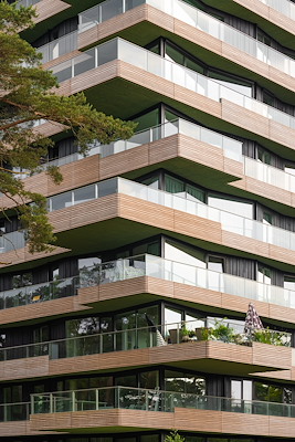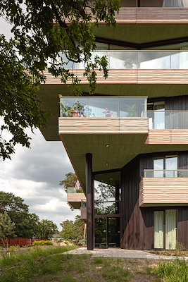 Binnen het thema ‘zand’ zijn de borstweringen uitgewerkt. Op basis van een zelf ontworpen patroon van zandribbels, zijn mallen gebouwd, waarin dunne GRC elementen gespoten zijn. De buitenplafonds, tegen alle onderzijden van de balkons, krijgen vorm binnen het thema ‘blad’, door een afwerking met groene ribbelvormige houtwolcement panelen met naaldmotief. De geprofileerde Fraké-houten gevelbekleding tot slot is binnen het thema ‘stam’ uitgewerkt.
