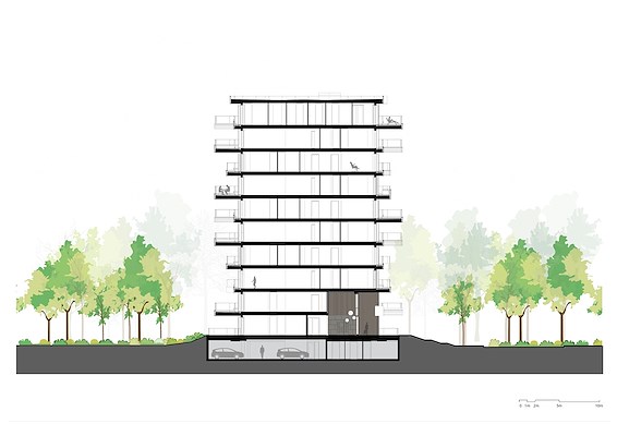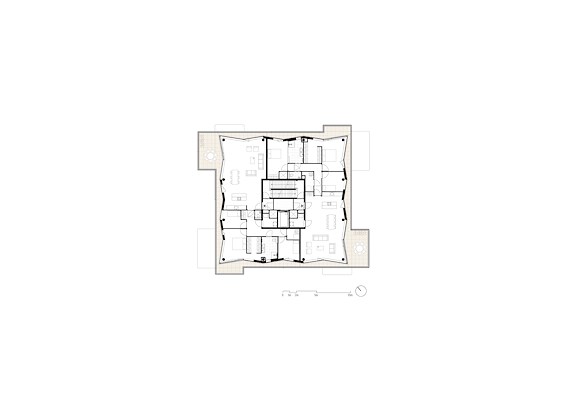 De toren oogt sculpturaal, maar is tegelijkertijd opgezet binnen een rationele grid-structuur, waarin de kern tezamen met de kolommen in de gevellijn de draagstructuur vormt. Deze structuur wordt doorgezet tot in de half verdiepte parkeergarage, waar zich ook de bergingen van de appartementen bevinden. Bovengronds telt het gebouw 10 bouwlagen, met op iedere verdieping 2 L-vormige appartementen, die overhoeks zijn ontworpen en spiegel symmetrisch georiënteerd zijn, waardoor een diversiteit in uitzicht en woonervaring wordt gecreëerd. De uitzondering binnen deze configuratie is de bovenste verdieping, waar zich een 360 graden rondlopend penthouse bevindt.