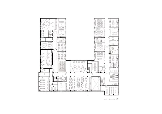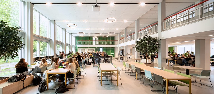In ons ontwerp behoudt de grote aula met theaterpodium ook in de nieuwe organisatie zijn logische en vertrouwde plek. Hierdoor blijft de uitstraling van deze dynamische ontmoetingsplek naar de Jan Ligthartstraat behouden. Daarnaast volgen we de bestaande constructie, die hier speciaal voor de aula uitgaat van een dubbelhoge ruimte. Naast de grote aula en in het verlengde van de tribunetrap plaatsen we de kleine aula. Zo ontstaat een uitnodigend ontmoetingsplein dat in verbinding staat met de Jan Ligthartstraat en de binnentuin, en via de tribunetrap met het ontvangstplein en het schoolplein.