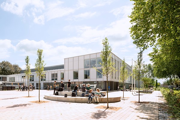 Een patroon van lichte aluminium raamkaders zorgt voor een sterke ritmiek. De kaders zijn open of gesloten, afhankelijk van de relatie met de omgeving, de wens van het achterliggende programma of de oriëntatie op de zon. De kaders openen het gebouw naar zijn omgeving en benadrukken speciale plekken als de dubbel hoge aula, een domeinplein, of het dramalokaal. Of de kaders zijn juist gesloten voor meer rust en privacy. Zo geven we het nieuwe gebouw een eigentijdse en karaktervolle uitstraling naar zijn omgeving en een duidelijke identiteit als uitnodigende en inspirerende leeromgeving.