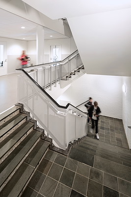 We maken een duidelijk herkenbare hoofdentree aan de zijde van het schoolplein zodat het gebouw zich nadrukkelijk richt op het landschap van de Nieuwe Campus. De entree wordt gevolgd door een uitnodigend ontvangstplein. Deze open en uitnodigende ruimte is het startpunt voor ieders schooldag. Het ontvangstplein staat via een grote tribunetrap in directe en open verbinding met de grote en kleine aula op de eerste verdieping. De combinatie van de aula's vormt het bruisende hart van de school.