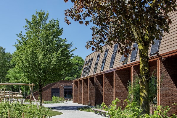 De buitenzijde van het gebouw is afgestemd op de omliggende bebouwing van het zorgpark van 's Heeren Loo. In dit mooie bosrijke park staan veel gebouwen die in de loop der tijd ontstaan zijn. Wij hebben daar iets aan toegevoegd dat past binnen het geheel van het park, terwijl het ook een eigenzinnige uitstraling heeft.