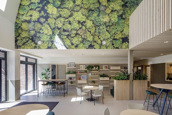Het interieur moest zo rustig mogelijk zijn met weinig afleidende prikkels. Ook het op zorg gerichte pve was een belangrijk uitgangspunt. We kozen hout en natuurlijke tinten als vaste basis. Die zorgen voor een vanzelfsprekend sfeervol geheel, zonder dat het gevoel van een zorgcomplex ontstaat. Het materiaal van de vloer is langs de wand opgetrokken tot onderhoudsvrije lambrisering die in verschillende hoogtes door het gebouw slingert. Diverse visuals geven op speciale plekken kleuraccenten. De klaslokalen onder de kap hebben door hun bijzondere vorm een besloten karakter.