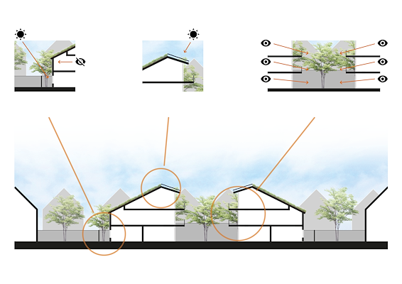 Verdichten in de bestaande stad geeft vele uitdagingen, daarom is het ontwerp van het Hamsterhof vormgegeven om zorgvuldig om te gaan met daglicht en privacy van de omliggende woningen. De twee bouwdelen vormen samen een hof in het hart van het plan. De dakvorm en oriëntatie van de woningen is zo ontworpen dat er geen sprake is van inkijk en schaduwval in de omliggende tuinen. Daarnaast draagt de unieke dakvorm bij aan een gevarieerd en speels straatbeeld, wat versterkt wordt door het groendak.