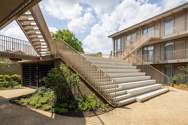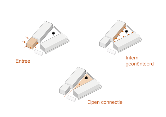 Het groene hof binnen het V-vormige gebouw kent verschillende plekken voor ontmoeting in en rondom deze centrale groenruimte. In het Poortgebouw bij de entree van het hof is een gemeenschappelijke huiskamer en keuken met daarnaast een aantal gemeenschappelijke voorzieningen zoals een waserette en een fitness. De centrale trap in het hof en de gemeenschappelijke tuinkamers tussen de woningen stimuleren het contact tussen bewoners, waardoor er een levendige en betrokken gemeenschap is ontstaan.