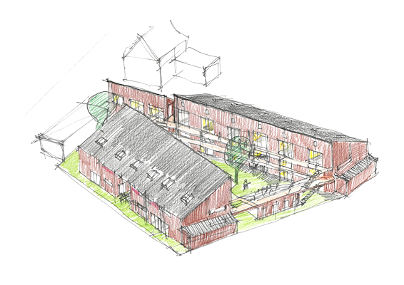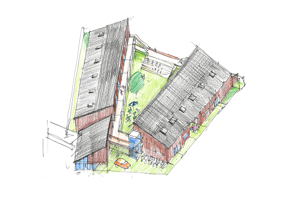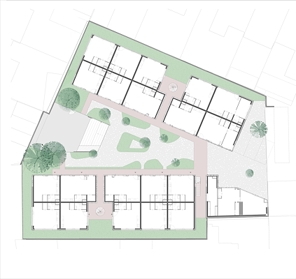 Het binnenterrein was volledig ingevuld met een stalen fabriekshal, hoewel omringd door groene tuinen deed dit afbreuk aan het woonklimaat. Met de nieuwe inpassing, waarin het tuinlandschap doorloopt over de daken tot in de binnentuin, komt er stedelijke groene buurt tot stand.