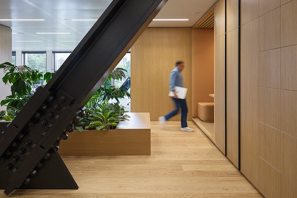 Een ander architectonisch element is herkenbaar aanwezig op iedere verdieping: een gesloten volume, in de kern van de verdiepingsvloer geplaatst. Deze volumes staan ruimtelijk en in materialisatie duidelijk in contrast tot de omliggende open en transparante werkomgeving. Waar neutrale en witte tinten de werkvloer tekenen, is het gesloten volume voorzien van warme eiken wandbekleding, kleurrijke akoestische fotoprints en een lichtgrijze vloerafwerking. Ruimtes om in alle rust en stilte te kunnen overleggen – voor een online meeting of een gesprek met collega’s of klanten – en informelere zitjes om elkaar kort te spreken zijn opgenomen in dit volume.