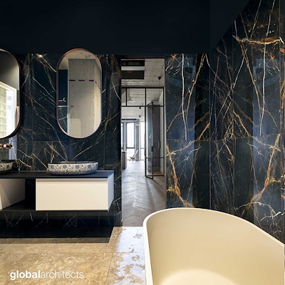 De badkamer is ontworpen met een combinatie van keramische en marmeren tegels. Het middelpunt is een vrijstaand bad, een designerwastafel van Delfts aardewerk en een zichtbare betonnen kolom van de hoofd draagconstructie.