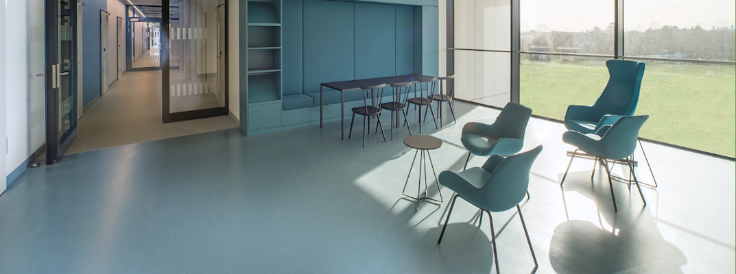 In het hele onderzoekscentrum worden rubberen vloeren uit de ARTIGO GRANITO collectie gebruikt. Dit is een zeer robuuste en duurzame kwaliteit die zeer aantrekkelijk is qua design met moderne kleuren, een glad oppervlak en een fijne, verschillend gekleurde nerf. Voor Arne Thorben Damm van RDS Partner was de veelzijdigheid van de vloerbedekking doorslaggevend: "In ziekenhuizen en onderzoeksfaciliteiten zijn er altijd gebieden met hogere eisen, dus zochten we naar een rubberen vloerbedekking die passende oplossingen biedt en tegelijkertijd een uniform vloerdesign mogelijk maakt." Als het gaat om verhoogde bescherming tegen vuil en krassen, is GRANITO met een extra na-vulkanisatiebehandeling voor een bijzonder dicht en bestendig oppervlak de juiste keuze. De planners van het nieuwe gebouw in Düsseldorf kozen vooral voor deze vloer in een lichtgrijze kleur. Voor de laboratoria met gevoelige technische apparatuur waren ESD-vloerbedekkingen nodig om schade door elektrostatische ontladingen te voorkomen. De GRANITO productfamilie biedt ook deze eigenschappen. Dat de rubber vloerbedekking ook op het gebied van duurzaamheid voorbeeldig is, wordt gegarandeerd door de vele onderscheidingen, van Cradle to Cradle Certified tot het gerenommeerde Duitse milieukeurmerk, de Blauwe Engel.