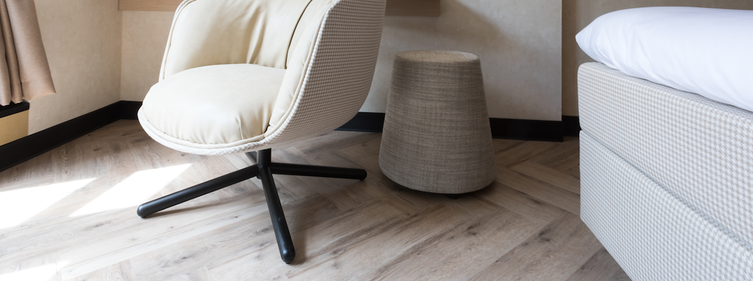 ) gelegd. Passend bij het boetiekdesign werden de vloeren in visgraatmotief gelegd. De gekozen vloer en de plaatsing benadrukken het feelgood-karakter van de comfortabel en luxueus ingerichte kamers. Omdat EXPONA COMMERCIAL vinylvloeren ongevoelig zijn voor vocht en 100 % waterbestendig, werden de designvloeren ook naadloos in de aangrenzende badkamers gelegd.