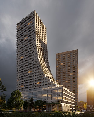 Een groots en hoog gevelproject: The Ensemble in Amsterdam. Twee woontorens van 100 en 120 meter hoogte die steigerloos worden gebouwd. Voor dit project heeft mbX de opdracht om meer dan 1500 elementen te leveren, variërend in kolommen, gevelbanden, plafondbekleding en gevelelementen.