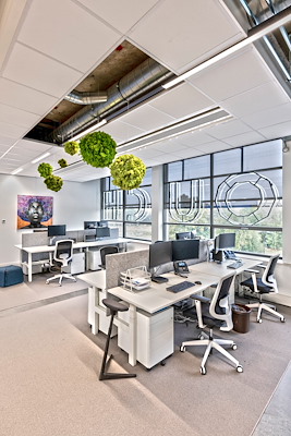 Open werkplekken passen bij de cultuur van de platte organisatie van CTOUCH, waarbij iedereen met elkaar samenwerkt.