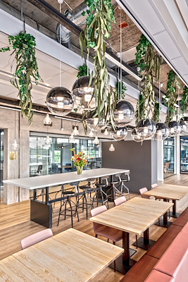 Iedereen van het bedrijf schuift aan bij de prima verzorgde lunch. B-too heeft daarvoor een ruime, groene, plek voor ingericht. Echt een plek om weer op krachten te komen.