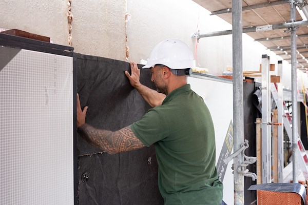 in 150mm dikte. De isolatieplaten zijn via BMN Eindhoven op dit project geleverd. Deze spouwmuurisolatie is licht van gewicht, levert een hoge thermische isolatiewaarde en heeft een lage MKI-score. Door de flexibele vezelstructuur sluit de spouwmuurisolatie goed aan op het binnenspouwblad en ook onderling sluiten de isolatieplaten heel goed aan. Je hebt als aannemer dus weinig risico op thermische lekken of een valse luchtspouw en extra afdichten is niet nodig.
