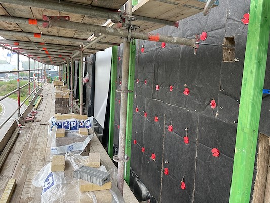 in 140mm dikte. De isolatieplaten zijn via BMN Nelemans Etten-Leur op dit project geleverd. Deze spouwmuurisolatie is licht van gewicht. Door de flexibele vezelstructuur sluit de spouwmuurisolatie goed aan op het binnenspouwblad en ook onderling sluiten de isolatieplaten heel goed aan. Je hebt als aannemer dus weinig risico op thermische lekken of een valse luchtspouw en extra afdichten is niet nodig.