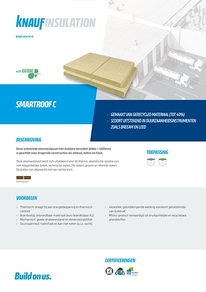 Zo kwamen ze uit bij de Smartroof C isolatieplaten van Knauf Insulation. Smartroof C is een onbeklede steenwolplaat met een dubbele densiteit (dikte = 100mm). De steenwolplaat leent zich uitstekend voor de thermo-akoestische isolatie van een plat dak, zoals bij Olround Bowling.