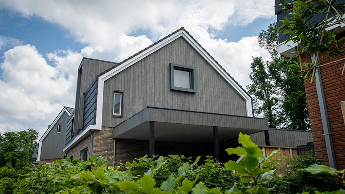 “Toen we van BMN de vraag kregen of we iets konden aanbieden in verschillende diktes en breedtes in bij voorkeur een grijze kleur, konden we meer dan genoeg mogelijkheden laten zien met Cape Cod. Uiteindelijk is de keuze gevallen op de semi-transparante kleur Highland Gray. Die heeft een beetje de look van vergrijsd hout. Bij Woonmarke de Eik is het door elkaar heen in meerdere verschillende profielen toegepast. Daardoor heeft iedere woning een eigen uitstraling gekregen, maar wel vanuit eenzelfde overkoepelende identiteit. Het is daardoor een wijk met samenhang geworden, zonder dat het een eenheidsworst is. En dat is ook wel uniek aan dit project. Want je ziet wel vaker dat meerdere huizen dezelfde uitvoering hebben, maar dan is het vaak ook bijna exact hetzelfde. Hier bij Woonmarke de Eik is door de variatie in de gevel, dankzij de verschillende diktes en breedtes, elke woning toch echt heel eigen.”