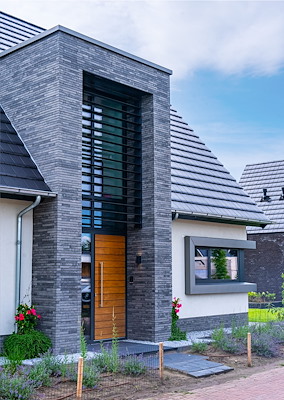 aan de voorgevel geeft de woning een unieke uitstraling, terwijl beide panelen de nodige privacy bieden. De