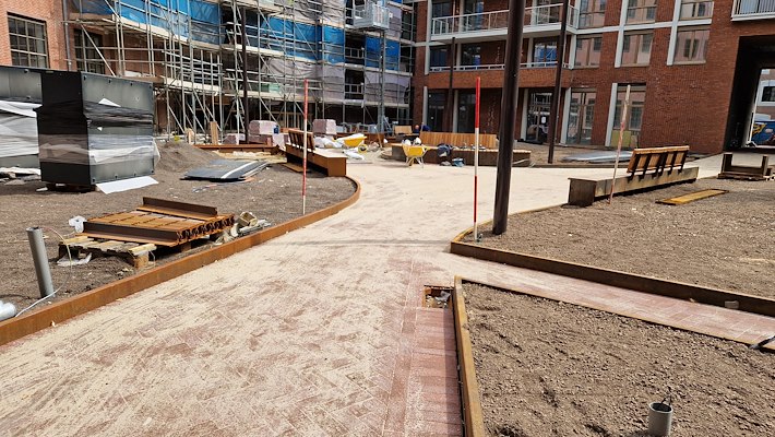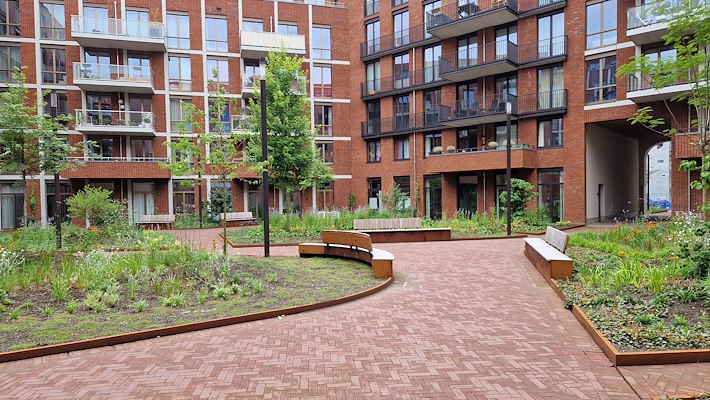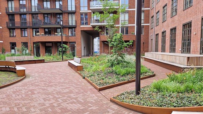 Tussen de plantenbakken zijn looproutes gecreëerd met bakstenen bestrating. De stenen zijn geplaatst op een laag grind, met het ND FV-300 Filtervlies, ND SG Schuimglas en het ND 620 Drainagesysteem eronder, inclusief ons ND TSF-100 Glij- en Beschermfolie onderaan het dakbedekkingssysteem voor extra bescherming.