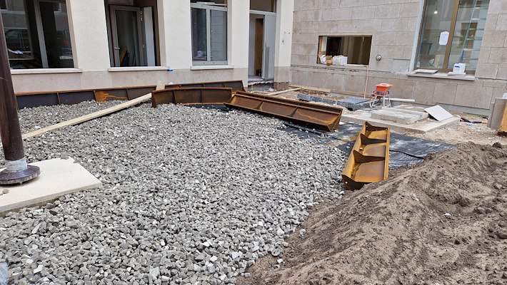 Het schuimglas is rechtstreeks geïnstalleerd bovenop het ND 620 Drainagesysteem en vervolgens samengeperst met een trilplaat. Ons ND 620 Drainagesysteem is geschikt voor dit doel vanwege het geweven filterweefsel dat op de noppenplaat is gelijmd. De hoge druksterkte en uitstekende kruipweerstand van het ND 620 Drainagesysteem zorgen ervoor dat de afwateringscapaciteit behouden blijft.