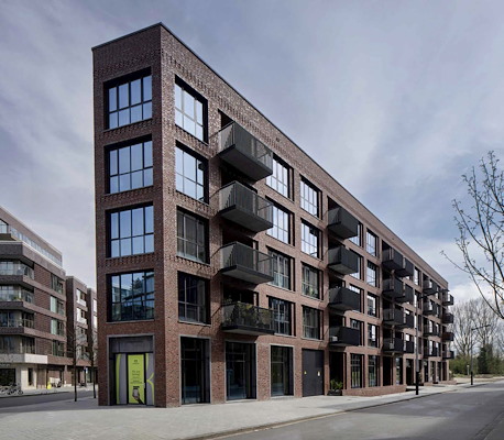 De contouren van het kavel vormden de uitdaging voor Diederndirrix architecten voor het ontwerp van dit woongebouw met 101 appartementen in Kop Zuidas. Rood geschakeerd metselwerk van hoogwaardige Wittmunder baksteen en industriële vensters geven het gebouw een kloek aanzien. Steenhandel Gelsing was betrokken als importeur van de bakstenen.