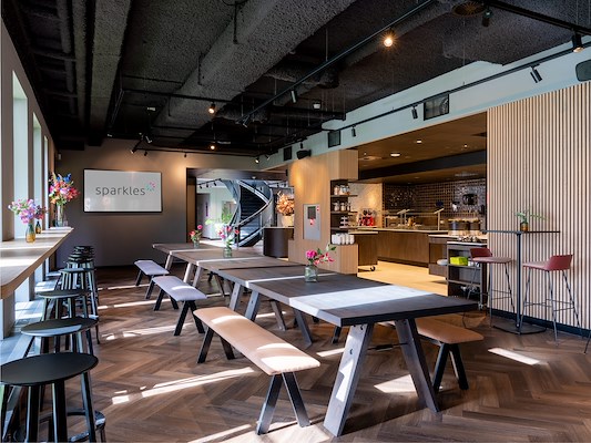 Sparkles is een interessant project met een grote diversiteit aan elementen. Het kantoor bevat naast werkplekken ook een horecagedeelte, loungeplekken, vergaderruimtes en een diningroom. Er is gewerkt met kleurthema’s per ruimte, wat een erg gaaf effect oplevert.