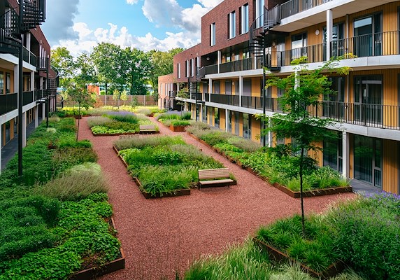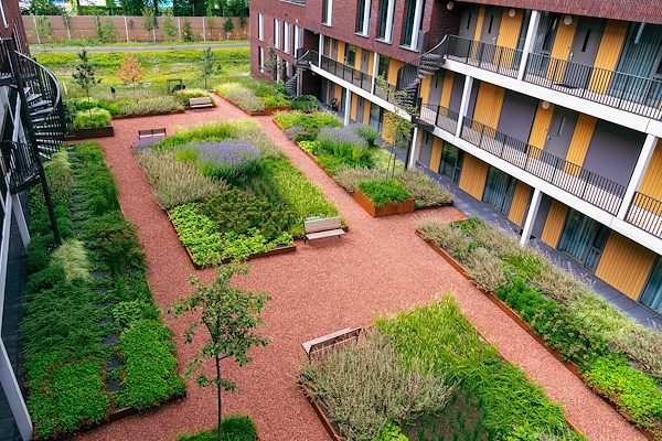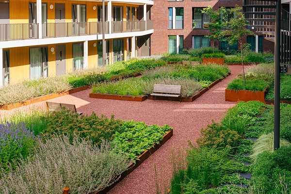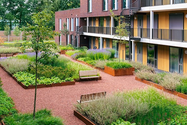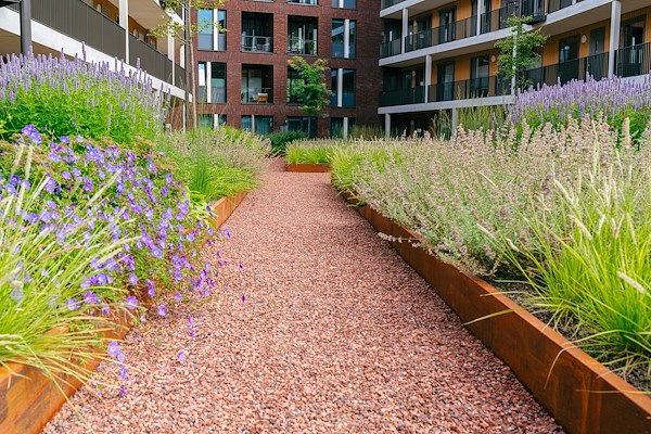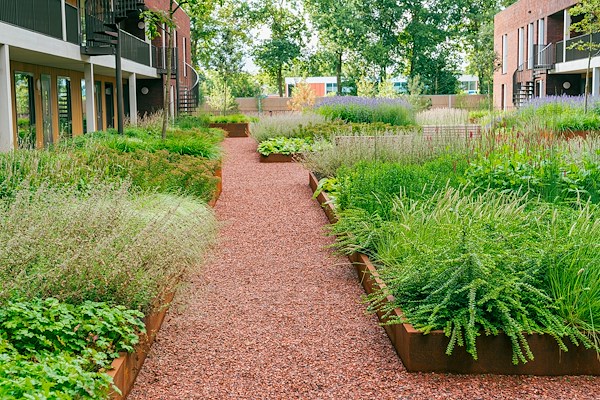 De ambitie van een duurzame bouw is meegenomen in de keuze van het gebruik van cortenstaal in de binnentuin. Cortenstaal is niet alleen duurzaam in gebruik, maar ook milieuvriendelijk. Het materiaal is 100% recyclebaar, wat bijdraagt aan duurzaam bouwen. De lange levensduur en het minimale onderhoud verminderen de milieu-impact gedurende de levenscyclus van het product. Bovendien zorgt het roestproces ervoor dat er een beschermlaag op het cortenstaal komt, waardoor verdere behandeling met oliën of verven niet nodig is. Dit geeft als resultaat dat cortenstaal sterk is en een duurzame keuze is die weinig onderhoud vereist en een natuurlijke uitstraling heeft.