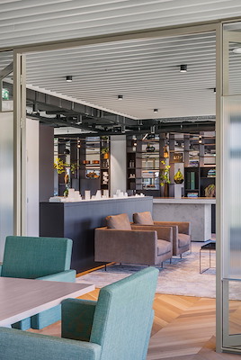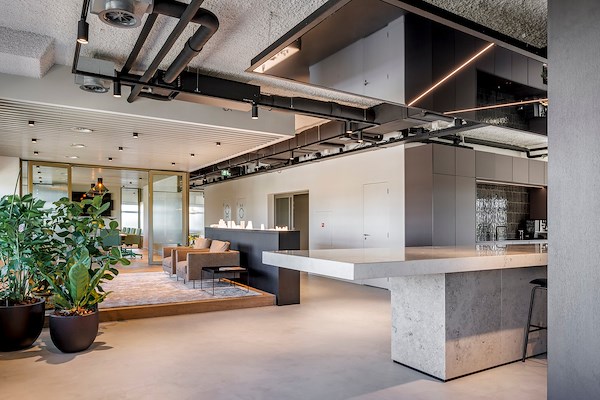 Ontvangst, informeel overleg, lunch en borrel; de 8 meter lange bar is dé samenkomstplek in het hart van het nieuwe kantoor van NEOO. De werkplekken en vergaderruimtes daaromheen zijn flexibel ingericht en gemaakt voor het hybride werken.