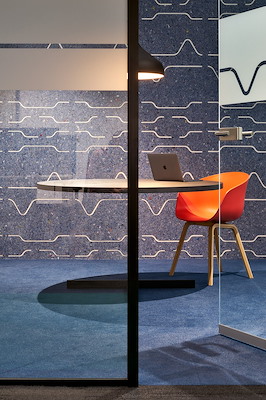 Groenendijk bedrijfskleidng over de systeemwanden van QbiQ: "Bijzonder tevreden over het eindresultaat. Met name de spreekboxen met ronde hoeken geven de gehoopte uitstraling."