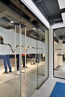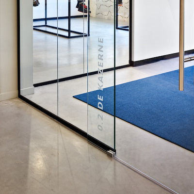 Detail of a glass sliding door in a glass partition wall system